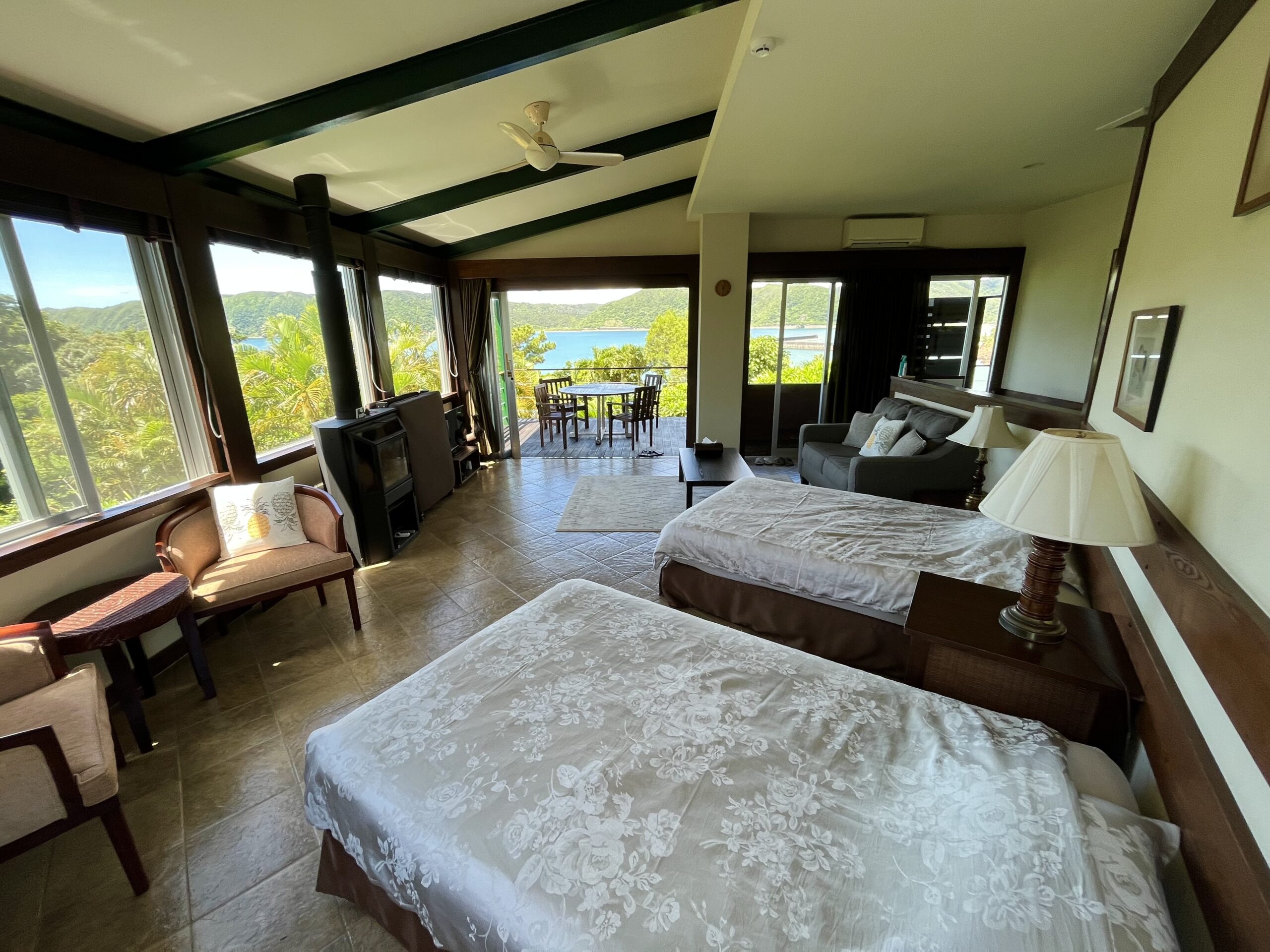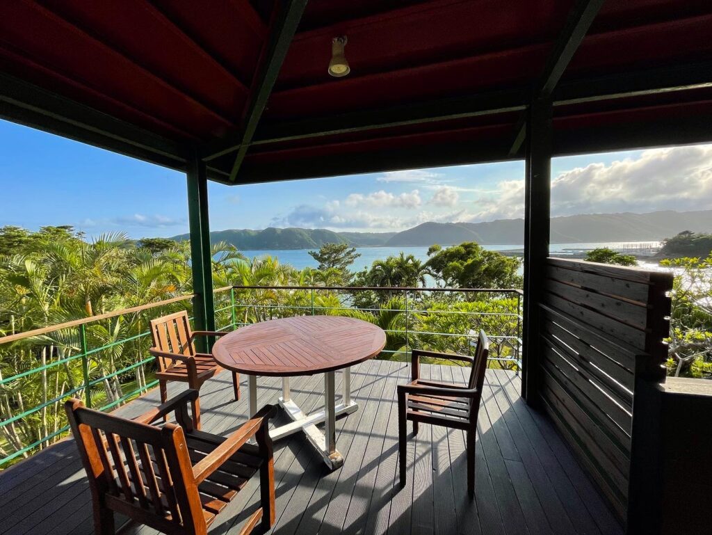 テラスから望むのは、やんばるの山々に囲まれた穏やかな海。背後には深い森の緑が広がり、夜には満天の星が瞬きます。